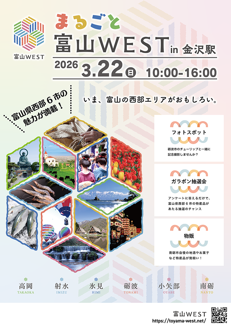 2026/03/16 イベント 富山WEST まるごと富山WEST in 金沢駅 2026年3月22日(日)金沢駅コンコースにて、「まるごと富山WEST in 金沢駅」を開催。 富山県西部6市の魅力を発信します。観光PR、ガラポン抽選会と盛りだくさん! 1日限り、ぜひ金沢駅にお立ち寄りくださ 3連休の最終日となりますが、ぜひ金沢駅にお立ち寄りください。