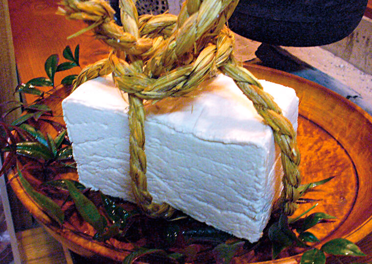 五箇山の澄んだ水と富山の大豆を使用した昔ながらの豆腐です。水気が少なく、縄でしばっても崩れないほど身がぎゅっと詰まった堅豆腐で、大豆本来の旨味を存分に味わえます。